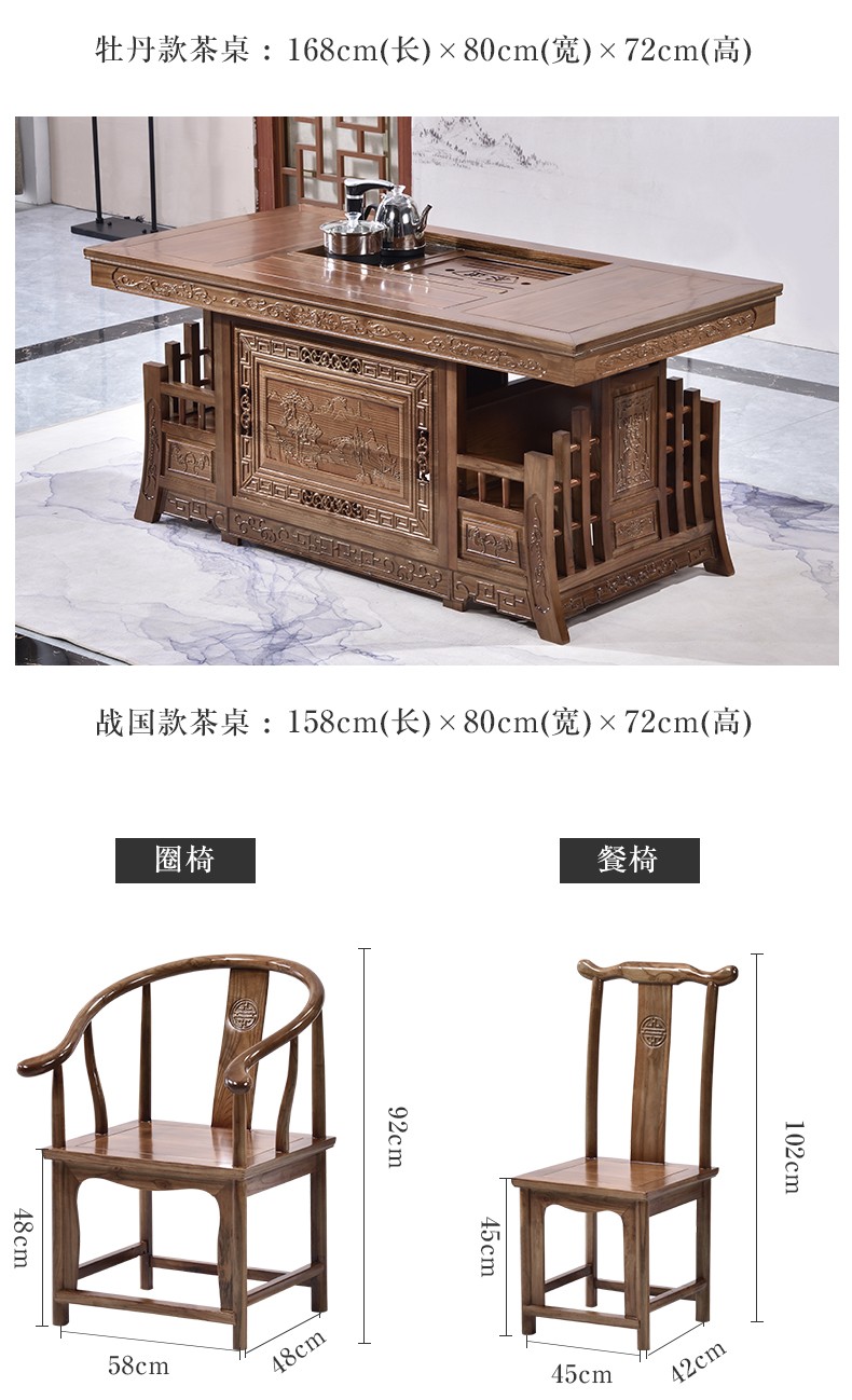 墨森葉純木茶テーブルセットみあいあいわせカンフー茶テーブルテーブルテーブルテーブルテーブルテーブル純木茶テーブルテーブルテーブルテーブル新中国式小戸ベランダ事務室南楡木茶道茶芸テーブル1.5メートルに成功して4つの食事椅子を配置しました。