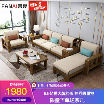 VSO LOVEソファァ纯木ソファ全纯木ファァァァ·全纯木フフファ·ファブリックソファ·现代シンフォイル新中国式ソファ·リビング家具四人+贵妃足(デフォルトのカードホルダー)组み立て